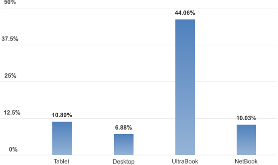 - The UltraBook's HDD averaged performance gains of over 44%. (This PC's SSD is used as a cache, not a primary storage drive).